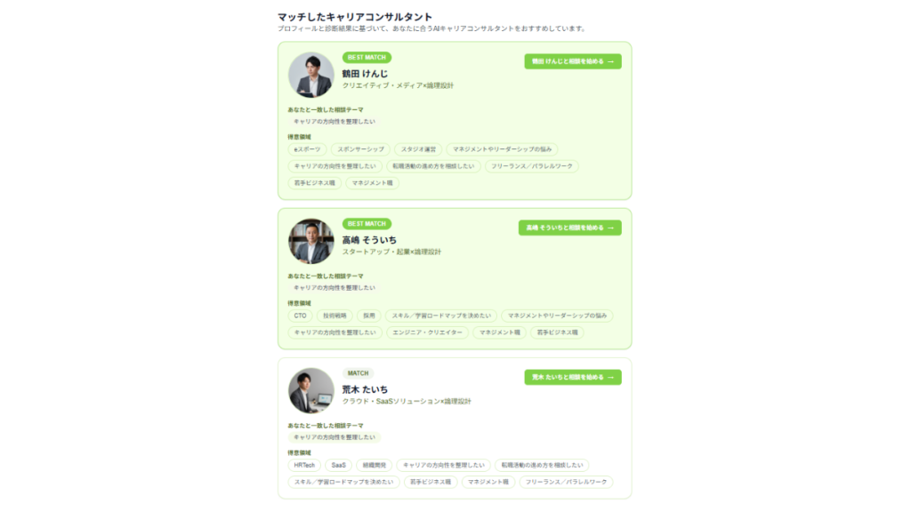 Kakedasが国家資格キャリアコンサルタントとのマッチングに活用してきた独自アルゴリズムを、「Kakedas AIキャリコン」にも応用しています。利用者の属性や相談テーマ、Big5による性格診断結果、望むコミュニケーションスタイルなどをもとに、100体のAIキャリコンの中から「最も話しやすい相手」を自動でマッチングします。「AIだけど話しやすい」「自分に合っている」と感じられる、対人相談に近いパーソナライズ体験を実現します。