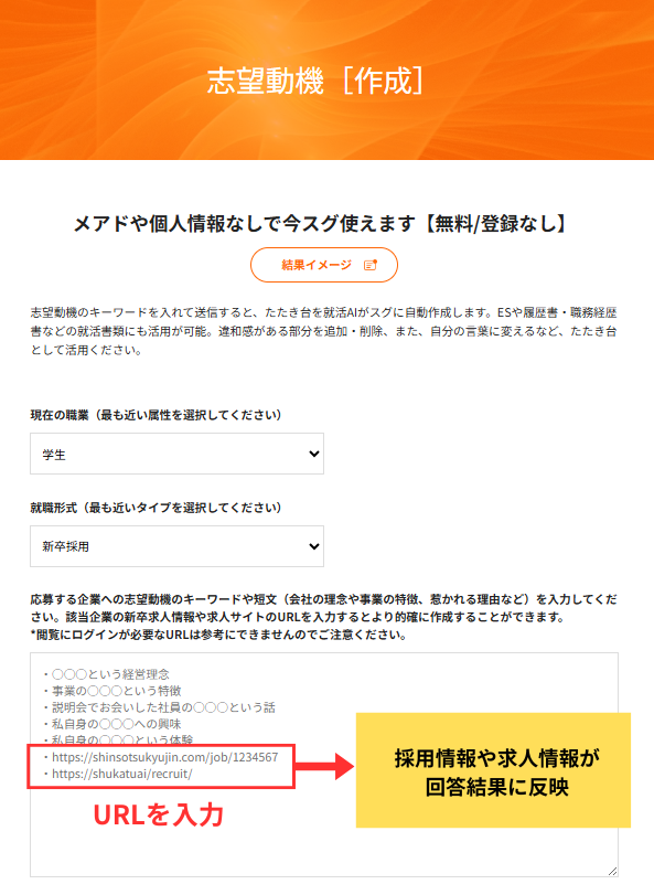 - 志望動機や逆質問のキーワード入力時に、読み取りたいサイトのURLを入力