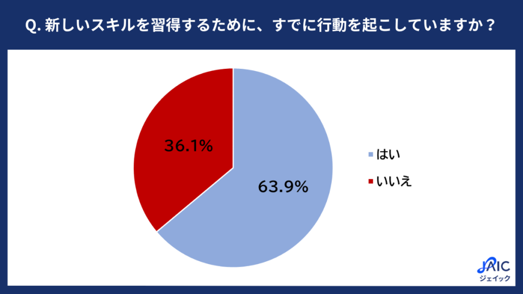 冒頭の設問で「習得したい」と回答した方に、「スキルを習得するために、すでに行動を起こしていますか?」と質問したところ、「はい」が63.9%、「いいえ」が36.1%となり、すでに行動を起こしている人が6割を超えました。