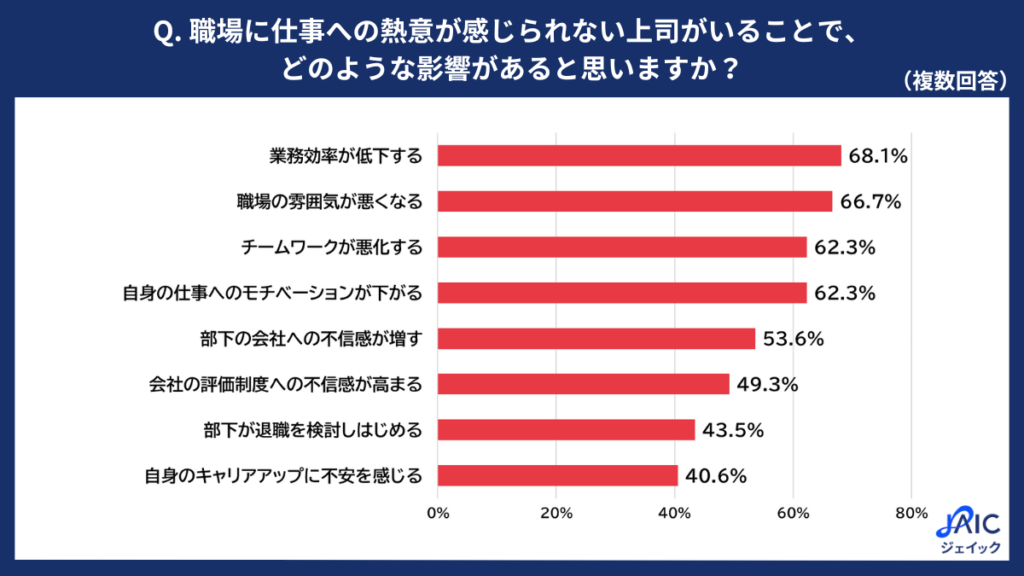 最後に、「職場に仕事への熱意が感じられない上司がいることで、どのような影響があると思いますか?あてはまるものをすべて選択してください」と質問したところ、「業務効率が低下する」が68.1%、「職場の雰囲気が悪くなる」が66.7%、「チームワークが悪化する」「自身の仕事へのモチベーションが下がる」がそれぞれ62.3%、「部下の会社への不信感が増す」が53.6%、「会社の評価制度への不信感が高まる」が49.3%、「部下が退職を検討しはじめる」が43.5%、「自身のキャリアアップに不安を感じる」が40.6%となりました。上司個人の問題が、チーム全体の生産性やエンゲージメントの低下にまで波及することを、若手社員が懸念していることがわかりました。