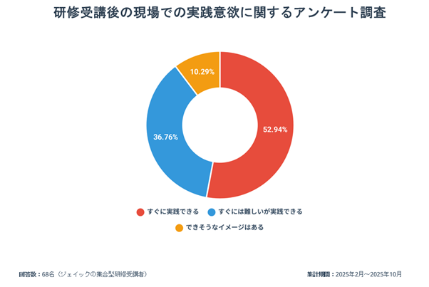 ジェイックの研修参加後アンケートでは、89.7%の参加者が「すぐに実践できる」「すぐには難しいが実践できる」と回答しています。